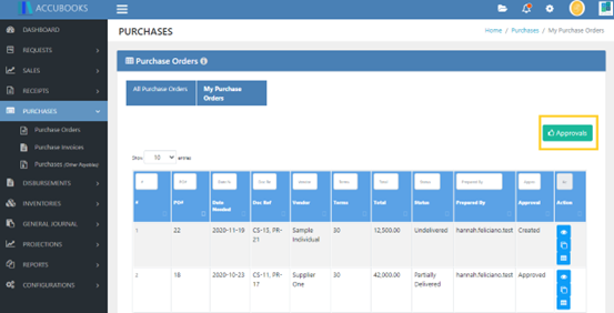 Special Note: Click the “Approvals Button” to be able to approve many transactions. The button can be found in the upper right side.