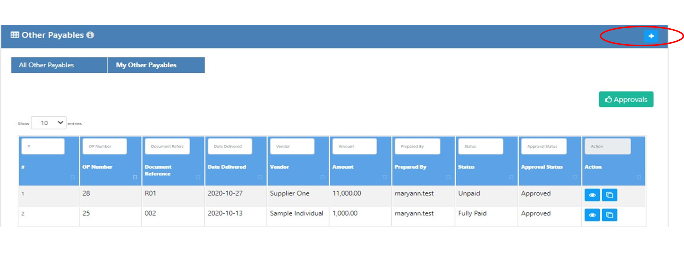 To add Other Payable transaction. Click the ADD Button at the upper rightmost portion.