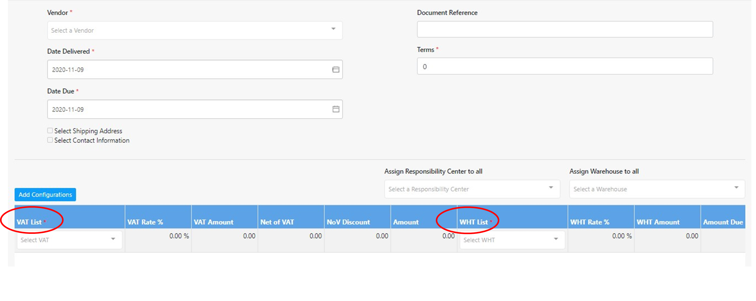 - Terms - default terms upon Vendor Configuration